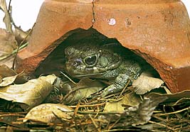 日本で最も大きなカエルです。おもに林の中の落葉の中で見ることができます。陸生のカエルなので、毎日霧吹きで湿らす程度で飼うことができます。目の後ろにある毒腺から、白い毒を出します。強い毒ではありませんが、この部分はさわらないようにしましょう。