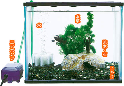 きれいな水を維持するために、エアポンプとフィルターを使いましょう。