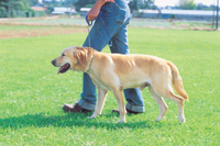 引っぱり防止に有効なのが、チョークチェーンという首輪である。犬が飼い主を引っぱったら、手首を効かせてガツンとリードを引っ張り、犬の首に衝撃を与えて犬をコントロールするものである。