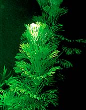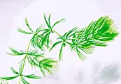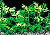国産のいわゆる金魚藻ですが、最近は、カボンバやアナカリスなどの外国産の "金魚藻" に押されて、熱帯魚店のほうがおなじみです。非常によく増えますが、新しい貝殻混ざりの砂には弱く、溶けることがあります。 |