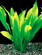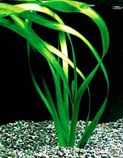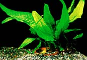 まるで、人工的に作ったような、透き通ったウェーブのかかった長い葉で、古くから人気のある種類です。高水温にやや弱く、葉は勢いよく展開していても、徐々に根茎が腐ってきて、突然枯れることがあります。 |