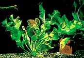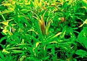 古くから親しまれているポピュラーな水草です。丈夫で、一本で60cm水槽の半分を覆うほどになります。葉にウェーブがかかったブロードリーフと、まっすぐなナローリーフが区別されていないときがあり、両者は別種です。 |