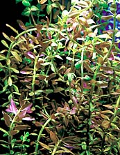 金魚藻でポピュラーなカボンバ・アクアティカの仲間で、成長している芽の部分が、赤くなるきれいな種類です。光量、二酸化炭素とも多くしないと、成長はするものの、赤い色は色褪せ、下の葉が枯れて水質を悪化させます。 |